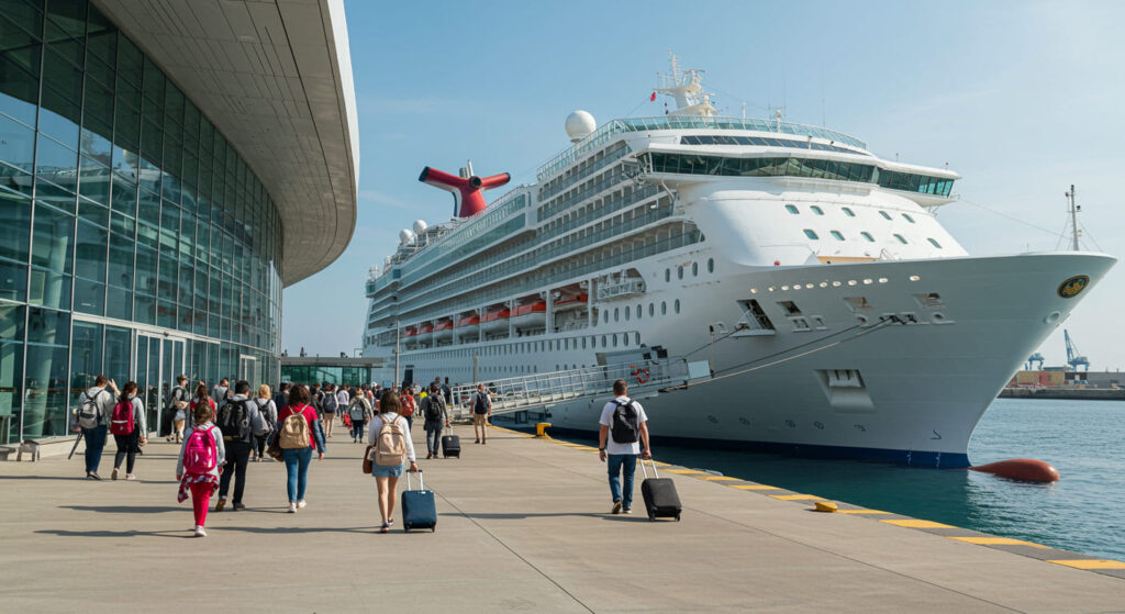 [Imagen: Terminal de cruceros en temporada alta con múltiples barcos]